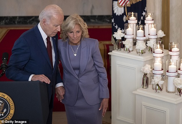The cards appeared to reference an event Biden held with the South Korean president in April 2023, where Bruce said: ‘You recently launched your re-election campaign.