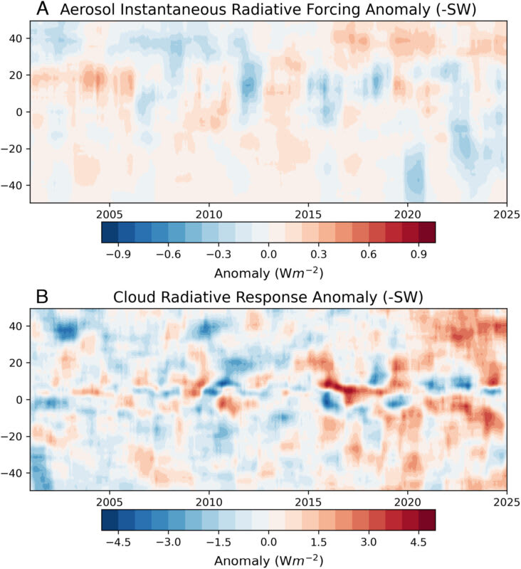 While the northern hemisphere shows a significant reduction in reflectivity, the southern hemisphere’s trends are shaped by different factors. The increase in aerosol concentration plays a major role in altering the energy balance in the southern hemisphere. Aerosols—tiny particles suspended in the atmosphere—help form clouds that can reflect solar radiation back into space. In the southern hemisphere, environmental events such as bushfires in Australia and volcanic eruptions like the Hunga Tonga eruption in 2021 and 2022 have contributed to an increase in aerosols. These particles reflect sunlight and can mitigate the effects of the darkening observed in the northern hemisphere.