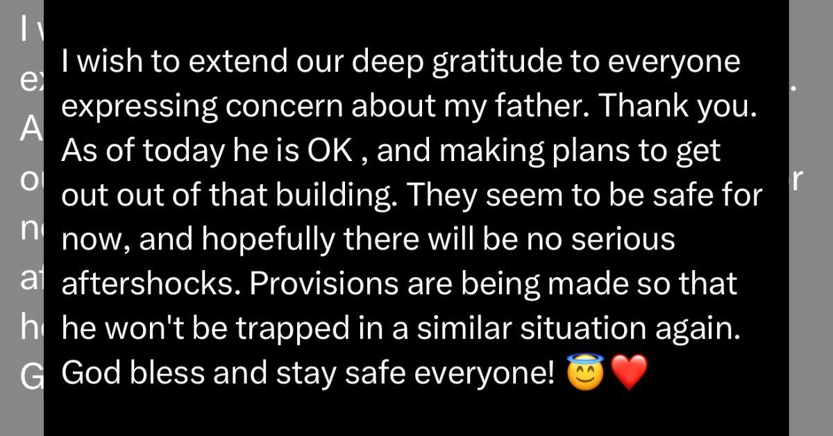 “I wish to extend our deep gratitude to everyone expressing concern about my father,” Samatha penned. “Thank you. As of today he is OK, and making plans to get out of that building. They seem to be safe for now, and hopefully there will be no serious aftershocks. Provisions are being made so that he won’t be trapped in a similar situation again. God bless and stay safe everyone!”