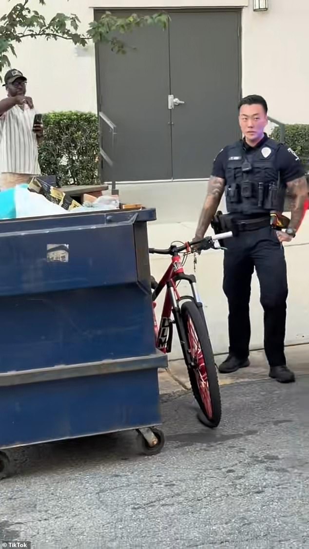 One officer is heard explaining the arrest to bystanders: ‘[If] they recklessly drive into traffic, hitting cars, we try to stop them. Obviously they take off, so we have to seize the bike… doesn’t matter if they’re a kid, it’s still illegal, right?’