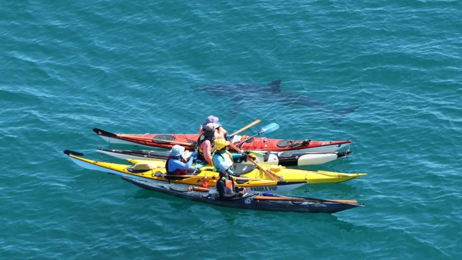 The same kayaking club was out paddling out on Saturday when an almost identical situation occurred, with a different great white circling them in a similar spot.