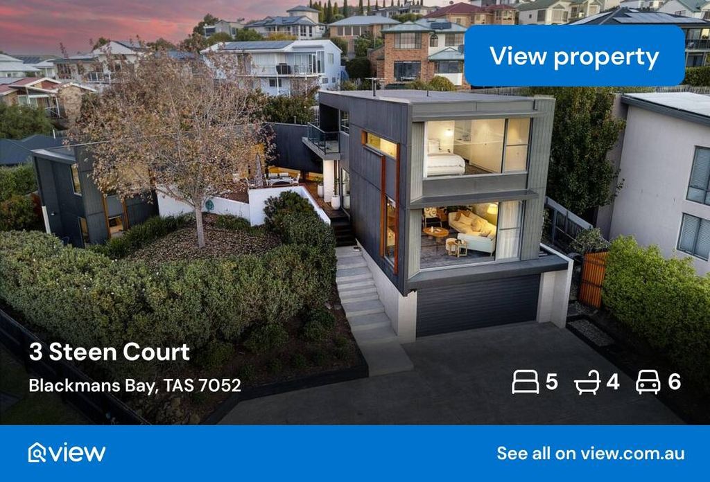 Only 300 metres from Blackman’s Bay beach, the modern home carefully integrates indoor and outdoor spaces to take advantage of the natural setting. Expansive decked areas create ample space for outdoor entertaining, while mature gardens create a serene outlook.